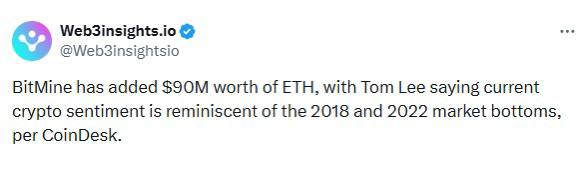 BitMine Immersion Technologies purchased 45,759 ETH last week worth approximately $90 million. Chairman Tom Lee compared current sentiment to the market lows of 2018 and 2022, describing investor confidence as "rock bottom." Treasury buys can shape narrative during weak markets, though ethereum price remains sensitive to broader macro conditions.