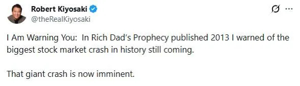 Robert Kiyosaki posted on February 17 that the "giant crash" he predicted in his 2013 Rich Dad's Prophecy is now imminent. He wrote he is "excited and can't wait" for the collapse, calling crashing assets "priceless assets going on sale." He added he is buying more Bitcoin as prices fall.